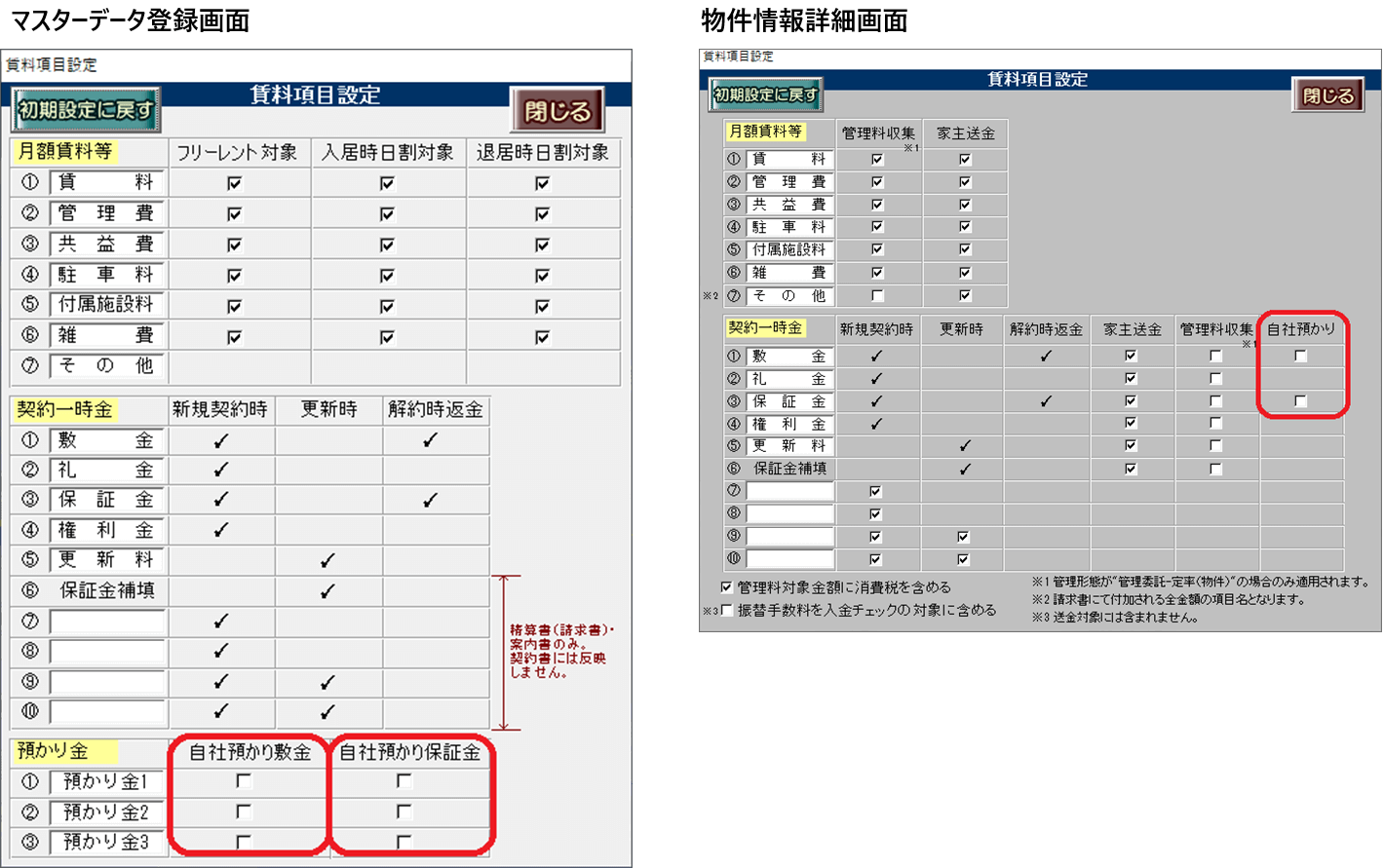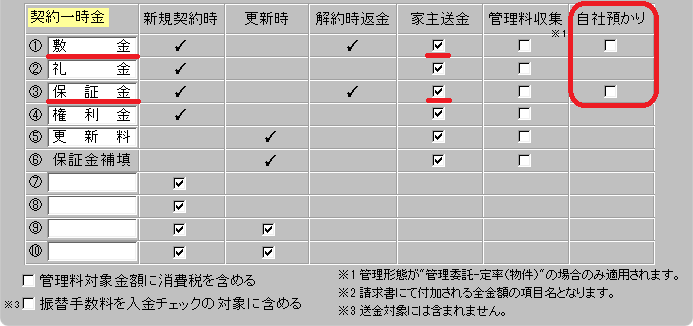 「敷金」の[自社預かり]チェック:ON ([家主送金]チェック:OFF)