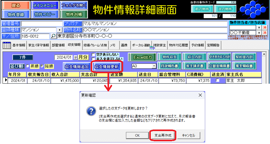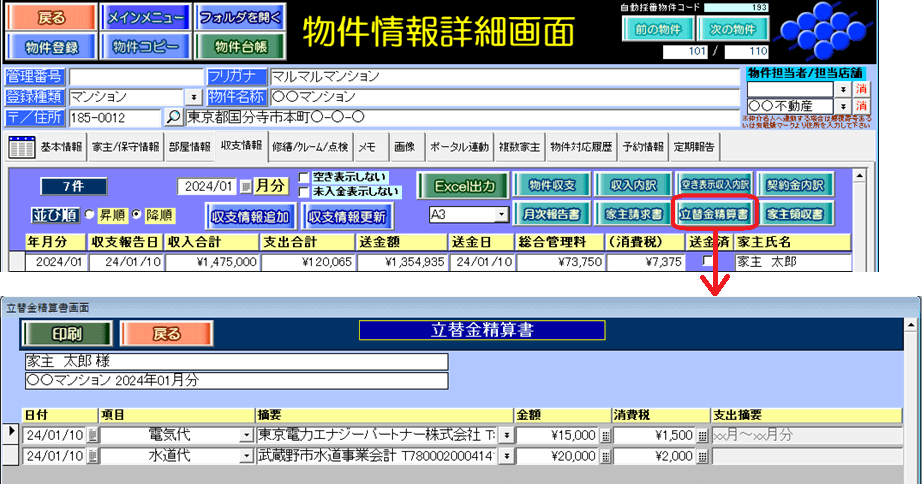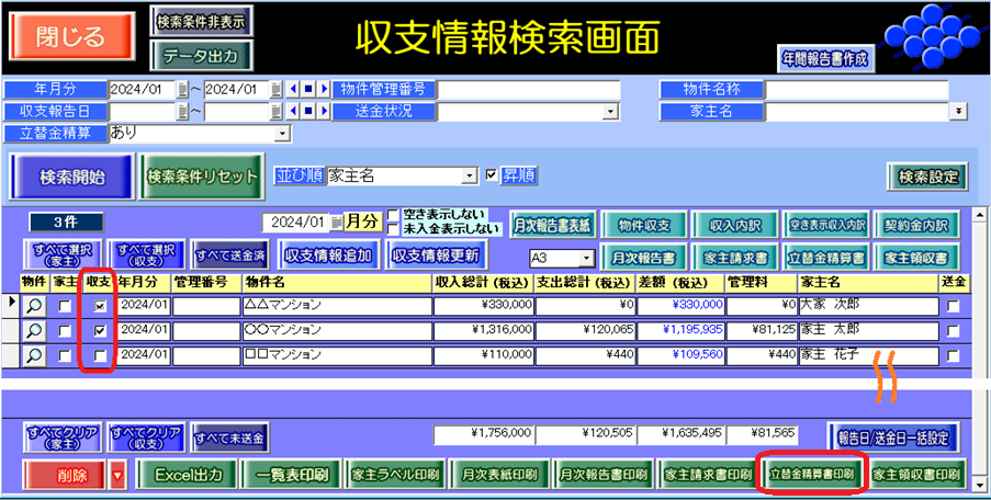 対象物件の[収支]チェックを付け、[立替金精算書印刷]ボタンを利用します。