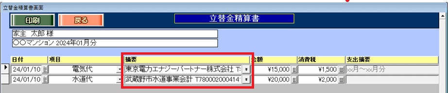 2.[立替金精算書]ボタン内に取引内容を入力する