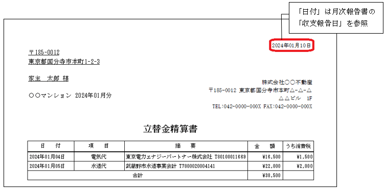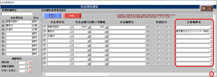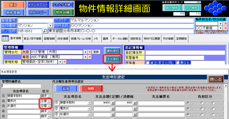 物件情報詳細画面の[基本情報]タブの[支出項目]ボタン内で、区分「立替」を選択した支払項目が帳票「立替金精算書」の印字対象です。