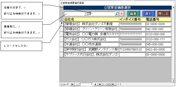[▼]ボタンを利用時は、対象支払先のレコードセレクタにカーソルを合わせ、[選択]ボタンを押します。選択候補が無い場合は、[編集]ボタンでマスター登録します。