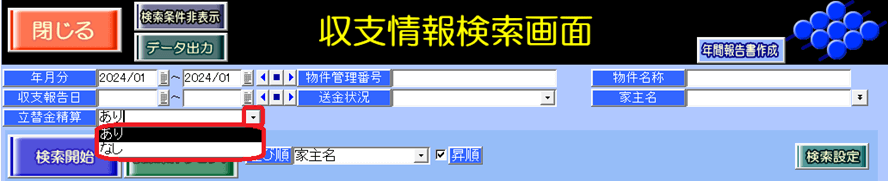 収支情報検索画面の検索条件「立替金精算」を用いて、立替金が発生した対象物件を絞り込みします。検索項目は初期設定で表示がありませんので、[検索設定]ボタンで条件を追加します。検索条件追加の操作手順は、弊社FAQ「15040」でご確認いただけます。