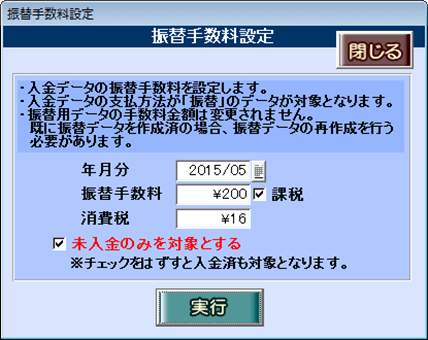 [手数料]ボタンを押すと、次のウィンドウが開きます。「年月分」「振替手数料」等の条件を指定し、[実行]ボタンを押します。