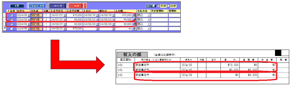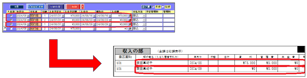 2.[分納を年月分ごとにまとめて表示する]チェックを外した場合