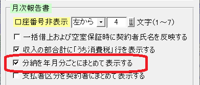 (3)帳票設定画面の月次報告書「分納を年月分ごとにまとめて表示する」の設定を変更します。