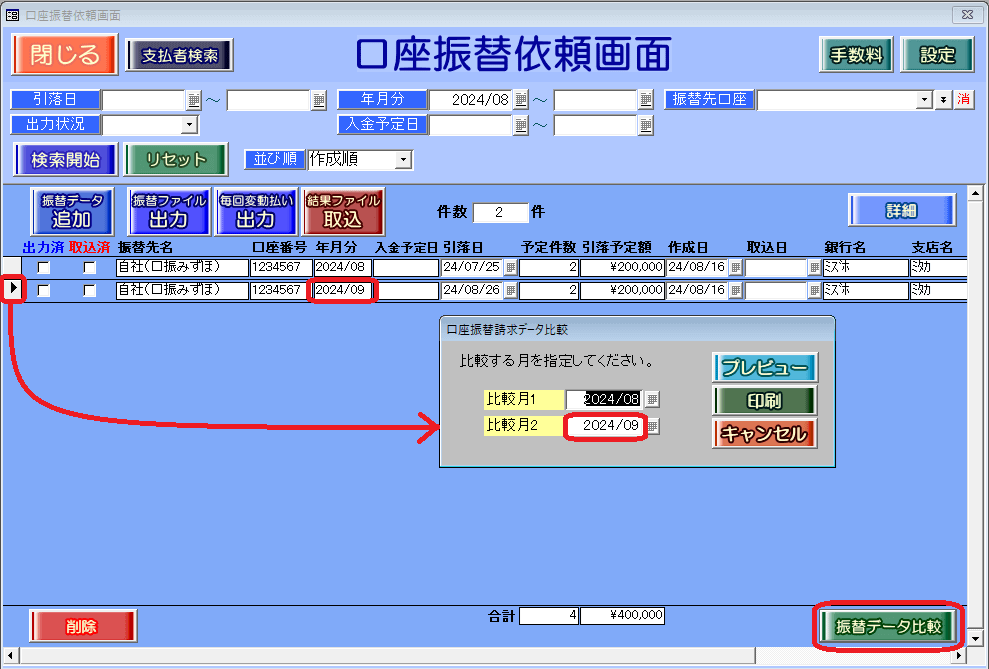回答・対処方法 本機能は、振替依頼データ送信前に前月送信分の請求レコードと比較し、差分をリストアップすることにより作成データのミスを検出する事にお役立ていただけます。