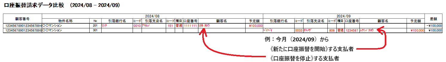 リストには以下の支払者が出力されます。 (1)前月と比較して《引落金額》が変わった支払者 (2)前月と比較して《引落口座》が変わった支払者 (3)今月から《新たに口座振替を開始》する支払者 (4)今月から《口座振替を停止》する支払者