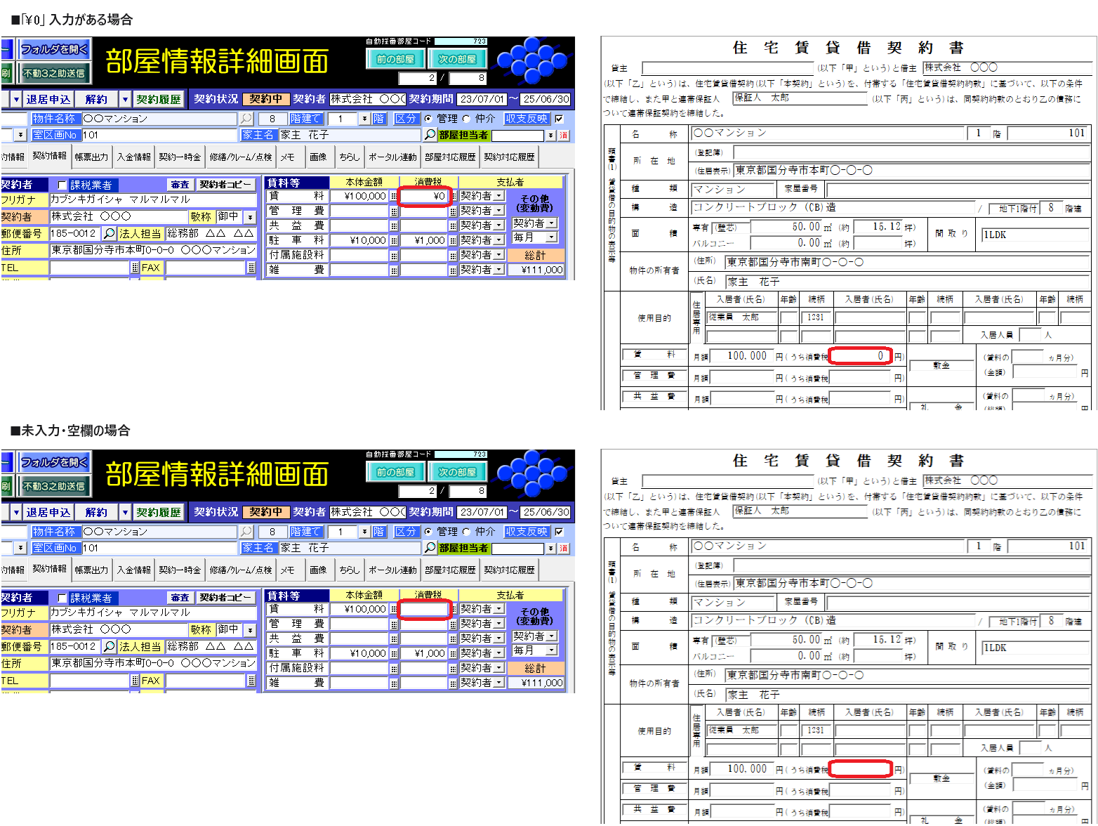 回答・対処方法 賃貸名人5.0.0未満は、帳票上の金額表示は「¥0」(固定)です。 賃貸名人5.0.0以上は、賃料等や契約一時金の金額の入力状況により、帳票上の金額表示が変わります。