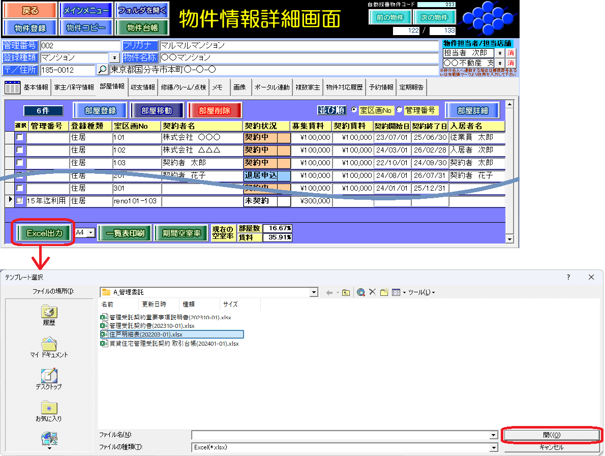 テンプレートは、物件情報詳細画面の[部屋情報]タブの[Excel出力]ボタンで選択します。