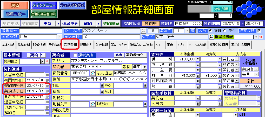 部屋情報詳細画面の[帳票出力]タブの「契約開始日」「契約終了日」を参照します。