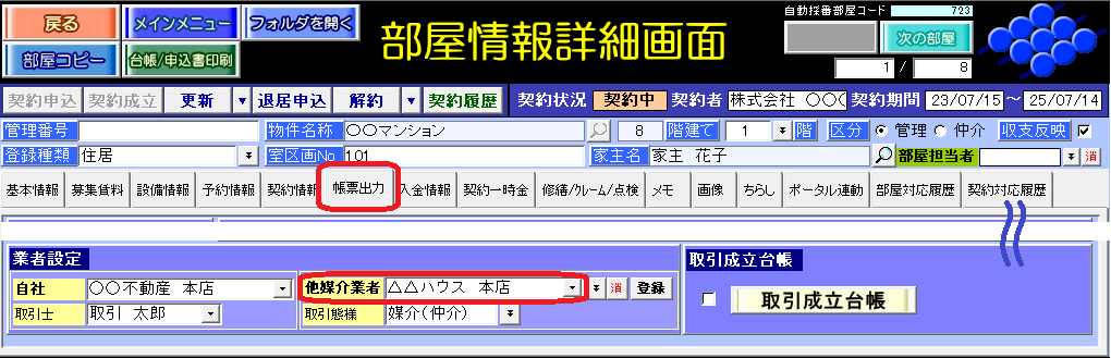 部屋情報詳細画面の[帳票出力]タブの[取引成立台帳]ボタンをご利用ください。