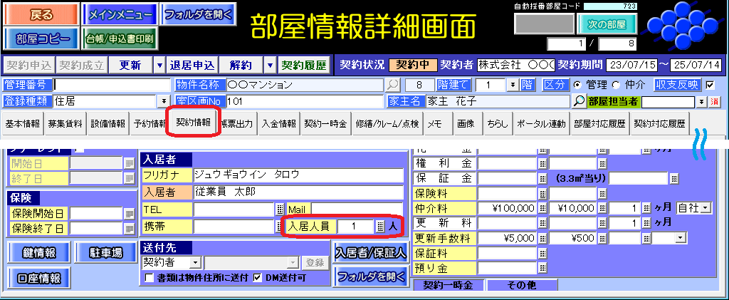 部屋情報詳細画面の[契約情報]タブの「入居者」欄=入居人員「〇」人を参照します。