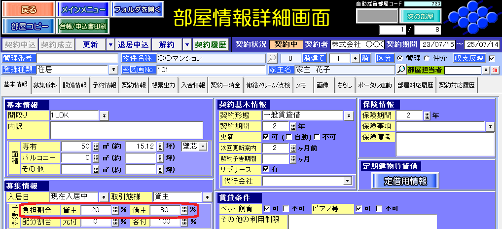 部屋情報詳細画面の[基本情報]タブの「負担割合」を参照します。