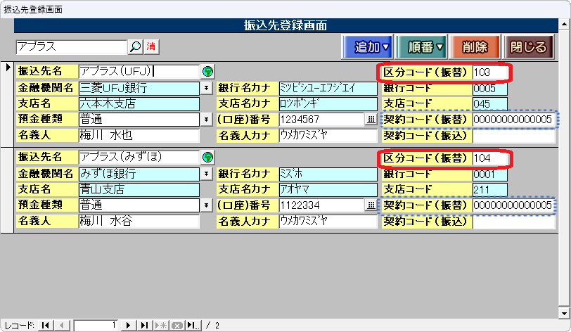 マスターデータ登録画面の[振込先]ボタンを押し、振込先登録画面を開きます。「区分コード(振替)」欄に、アプラス振替の区分を入力します。
