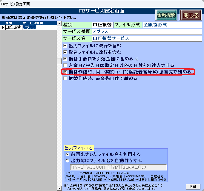 [振替作成時、同一契約コード(委託者番号)の振替先で纏める]チェックを付けます。