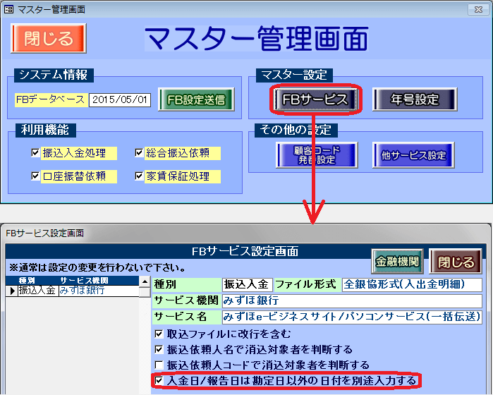 マスター管理画面の[FB サービス]ボタン内の設定[入金日/報告日は勘定日以外の日付を別途入力する]チェックは、勘定日(振込日)以外の日付を入金情報に指定できるよう確認ダイアログを表示させる機能です。