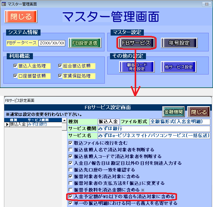 回答・対処方法 マスター管理画面の[FB サービス]ボタン内の設定[入金予定額が¥0 以下の場合も消込対象に含める]チェックは、入金予定額が¥0 以下の場合に入金レコードの消し込み対象にするかどうかを選択することができる機能です。