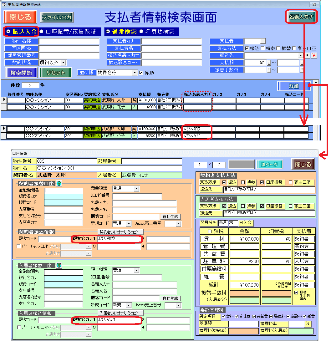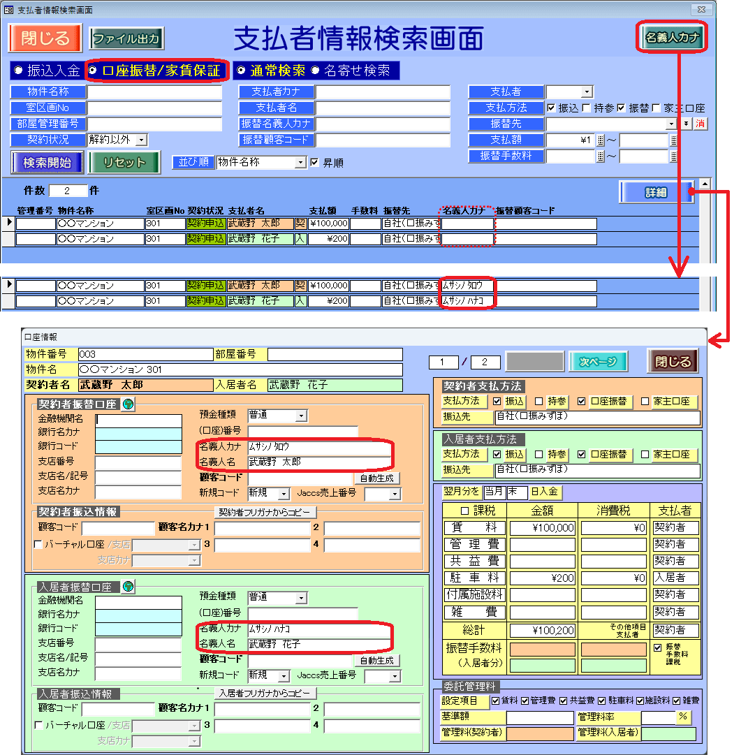 「口座振替/家賃保証」を選択して[名義人カナ]ボタンを実行した場合、 「名義人名」と「名義人カナ」が入ります。