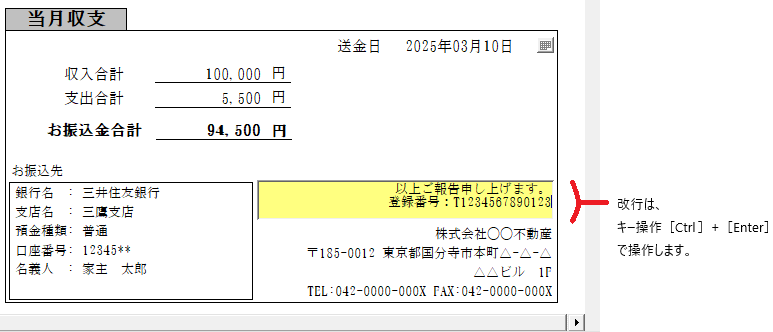このようなお問い合わせに対して、月次収支報告書の右下に配置された「以上ご報告申し上げます。」という雛形欄に自社のインボイス番号を加筆する方法を案内することがあります。重ねてこれは弊社月次収支報告書の設計思想に全くそぐわない工夫であり、弊社としてこの方法を推奨するものではありません。