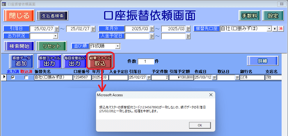 「振込先マスターの振込先口座番号または振替契約コード(XXXXXXXXXX)が一致しないか、銀行データの引落日(20XX/XX/XX)と一致しません。処理を中断します。」