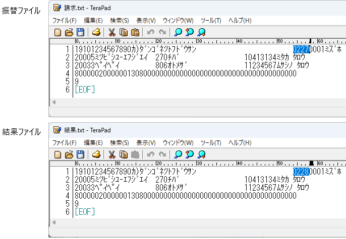 ①結果ファイルのヘッダーレコードの「引落日」をメモ帳で確認します。