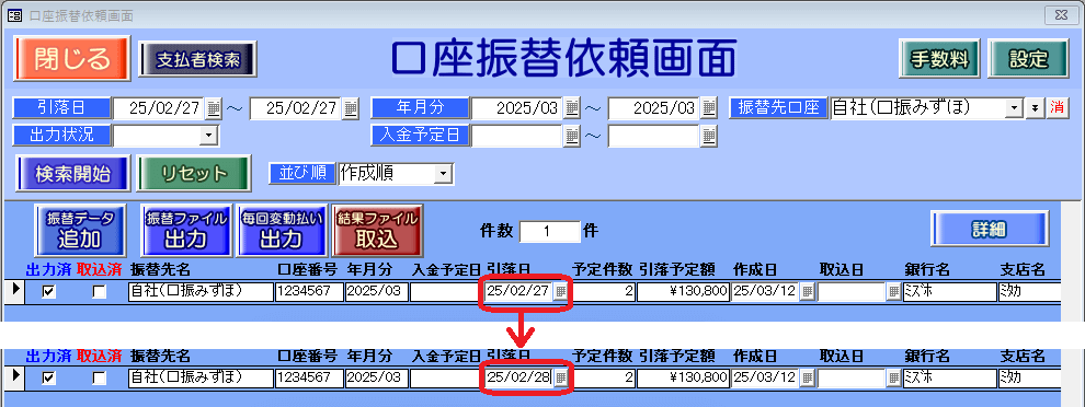 振替ファイルは引落日「02/27」で送ったが、
