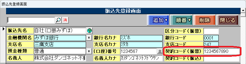 ②賃貸名人のマスターデータ登録画面の[マスター項目]タブの[振込先]ボタン内で、「契約コード(振替)」の入力に誤りがないか確認します。