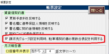 [請求先グループ設定利用時、駐車場契約書の複数台表記を利用する]チェックを付けます。