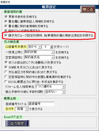 マスターデータ登録画面[基本情報]タブの[帳票設定]ボタン内の「請求先グループ設定利用時、駐車場契約書の複数台表記を利用する」チェックボックスにチェックを付けます。