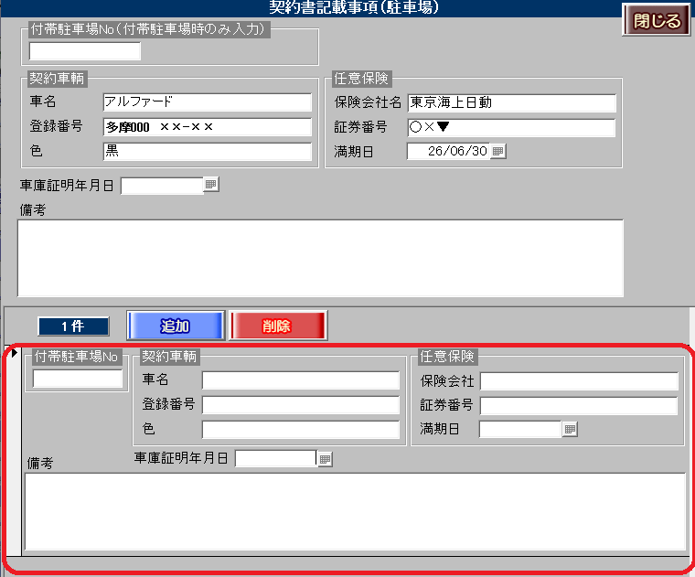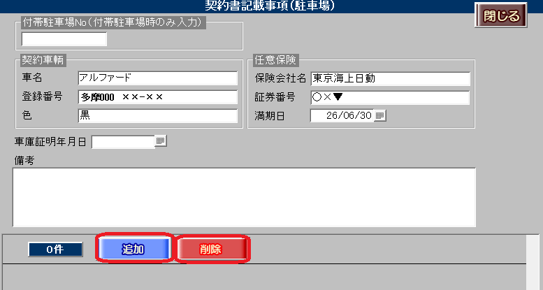 付帯駐車場が複数区画ある場合や複数車輌が利用することを想定し、駐車場情報を複数登録ができるよう、部屋情報詳細画面[契約情報]タブ[駐車場]ボタン内に[追加]ボタンおよび[削除]ボタンを新設いたしました。