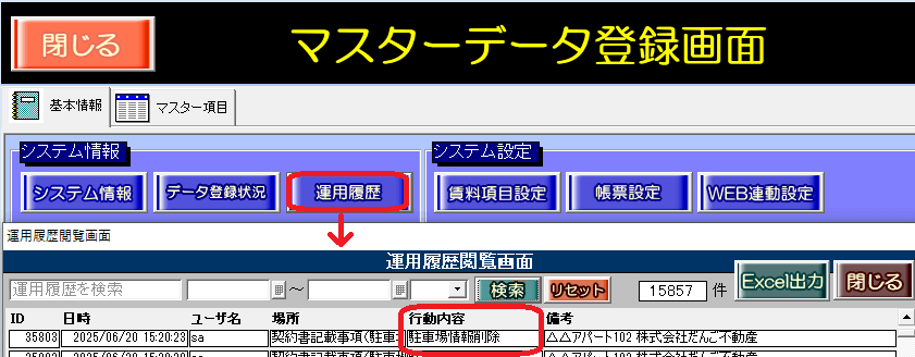 ※削除した履歴は、マスターデータ登録画面[運用履歴]ボタン内に、行動内容「駐車場情報削除」と記録が残ります。