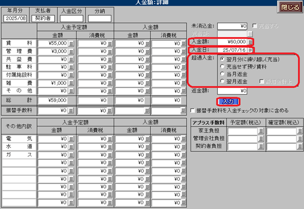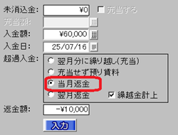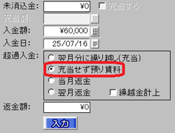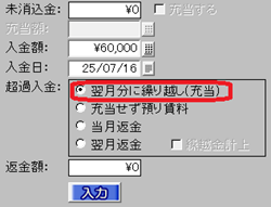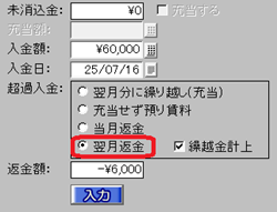 「入金額」と「入金日」(任意※)を入力後、「超過入金」を選択の上、[入力]ボタンを押すと入金処理が行われます