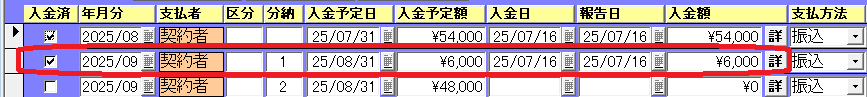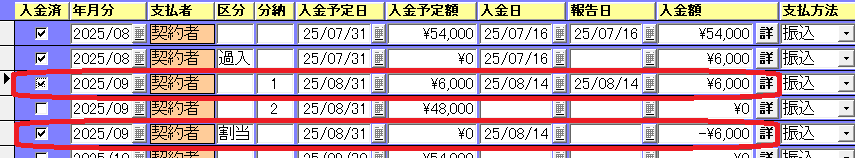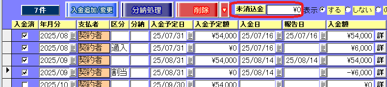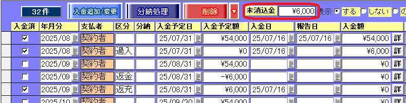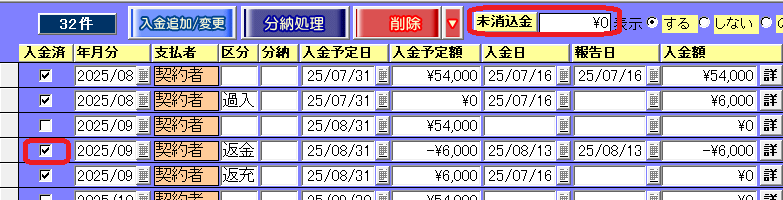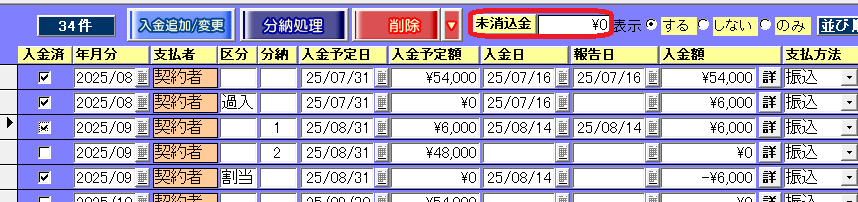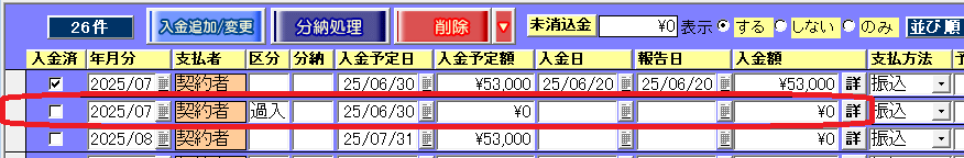 充当額が消込されるため、入金予定額総計に対して不足がある場合は分納処理されます。