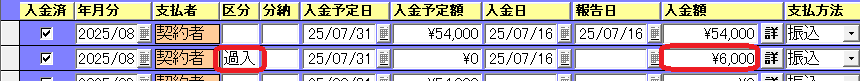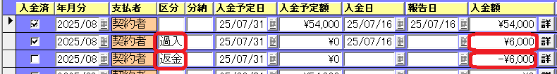 区分「過入」として、入金額に超過額をセットした、入金レコードが追加されます。