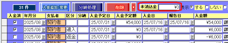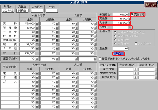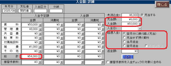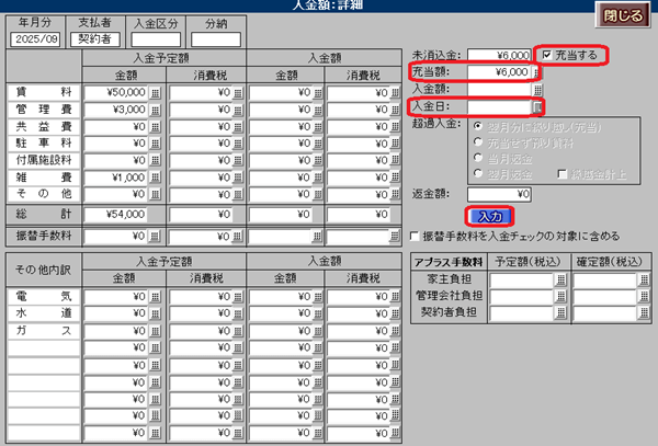 ※充当額+入金額が入金予定額総計に対して不足がある場合、分納処理されます。