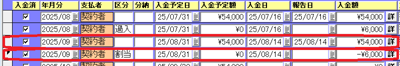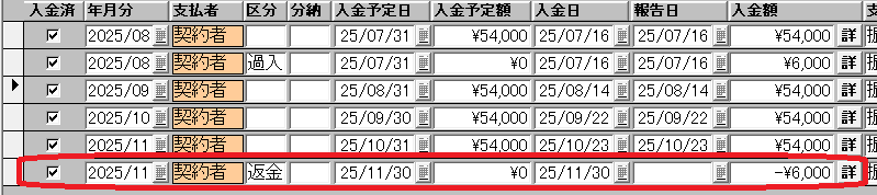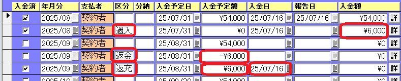 ・区分「返金」として、翌月分の入金予定額に超過額をマイナスでセットした入金レコード。