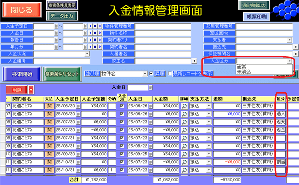 ・区分ごと表示ができるよう、検索項目「入金区分」を新設しました。