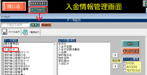 ・一覧表が作成できるよう、「データ出力」機能にデータ項目「入金区分」を追加しました。