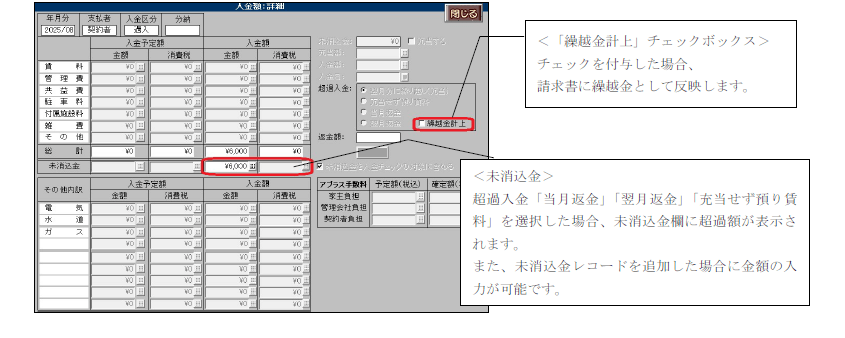 超過入金の処理は、ウインドウ「入金額:詳細」より行います。