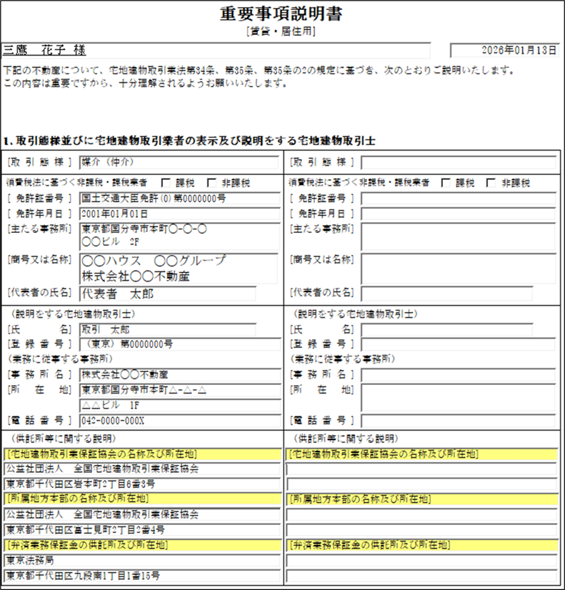 重要事項説明書の「1、取引態様並びに宅地建物取引業者の表示及び説明をする宅地建物取引士」欄の以下の項目は、営業保証金等の項目名を用いることができるよう標準帳票の雛型です。