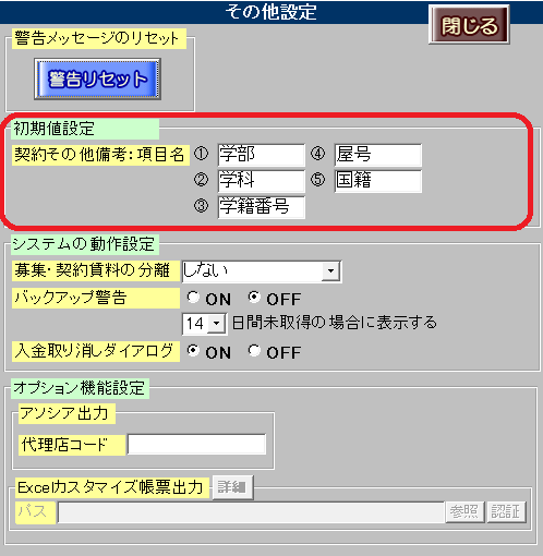 部屋情報詳細画面[契約情報]タブの[その他備考]ボタンの項目をあらかじめ設定しておくことはできますか?