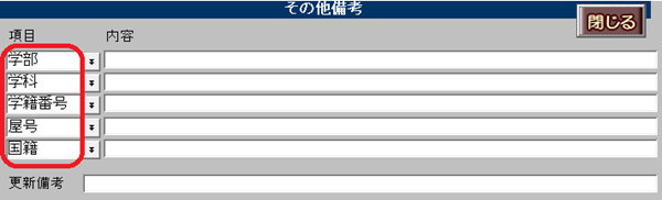 <回答・対処方法> マスターデータ登録画面[その他設定]ボタンにて「契約その他備考:項目名」を設定することができます。 入力した項目名は、[契約申込]ボタンを押下時に部屋情報詳細画面[契約情報]タブの[その他備考]ボタンに自動表示されます。 ※すでに項目を入力済みの契約者(契約状況が「契約申込」「契約中」「退居申込」「予約」「解約」の契約者)には反映いたしません。