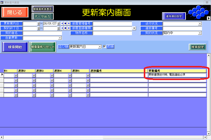 更新案内画面の[更新備考]に文字を直接入力できません。反映元はありますか? [対象Ver.:賃貸名人6.2.0 以上]