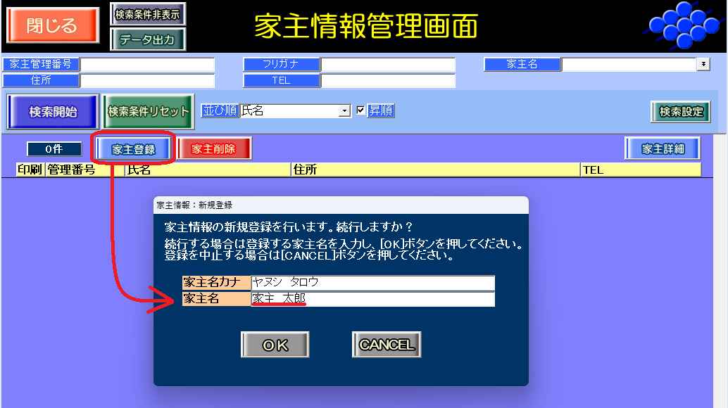 家主情報管理画面の[新規登録]ボタンで新しい家主を登録します。