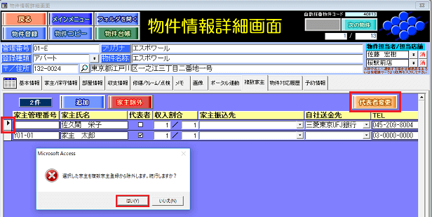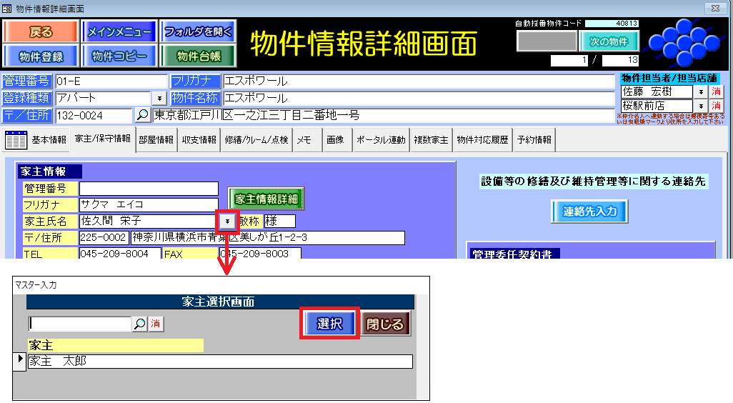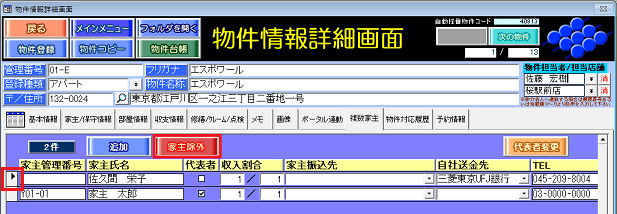 物件情報詳細画面の[家主/保守情報]タブの「家主氏名」欄の右側にあるボタンを押し、家主選択画面の一覧から新家主を選択します。