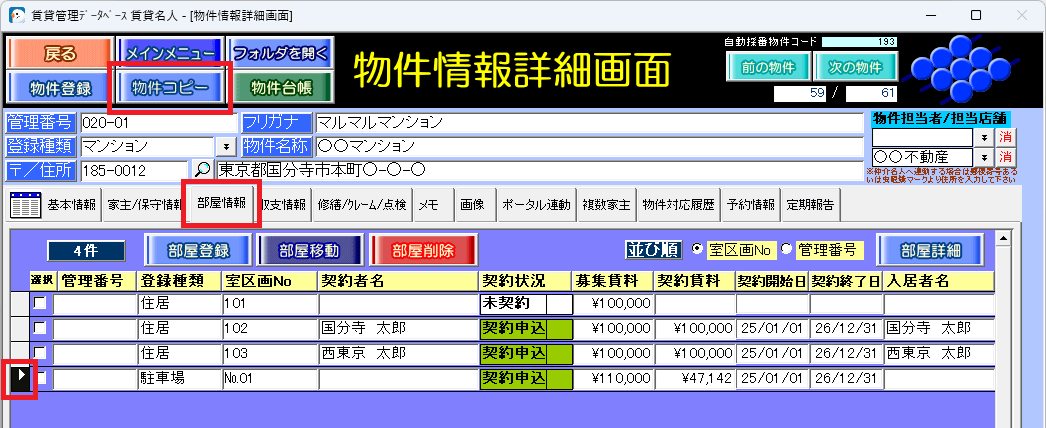 コピー元の物件情報詳細画面を開き、[部屋情報タブ]で部屋を1つ選択します。