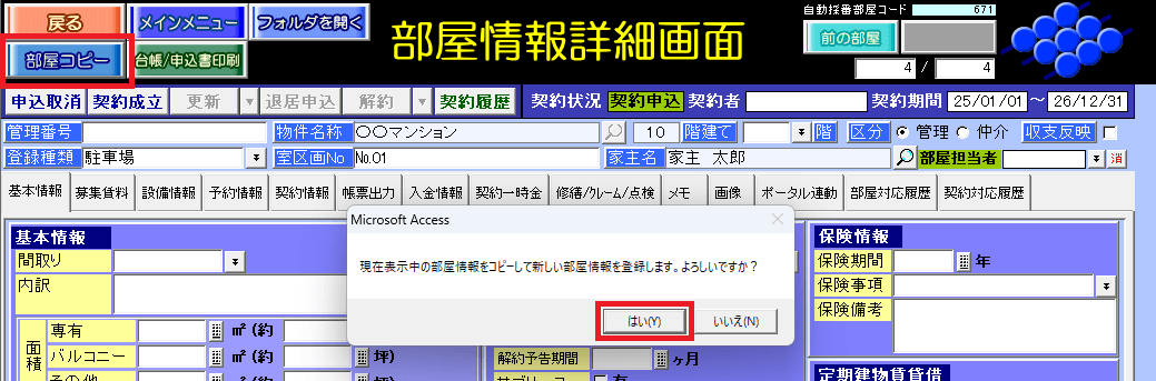 「現在表示中の部屋情報をコピーして新しい部屋情報を登録します。よろしいですか?」