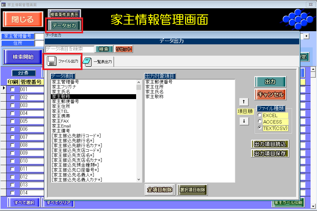 ①ファイル出力機能の[データ出力]ボタンで「出力対象項目」とファイル種類「TEXT(CSV)」を選択し、[出力]ボタンをクリックします。