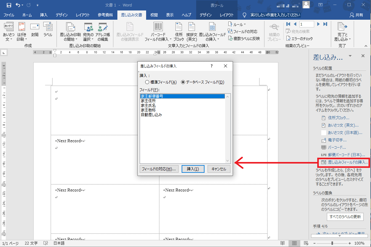 ⑨[差し込みフィールドの挿入]で項目を選択します。