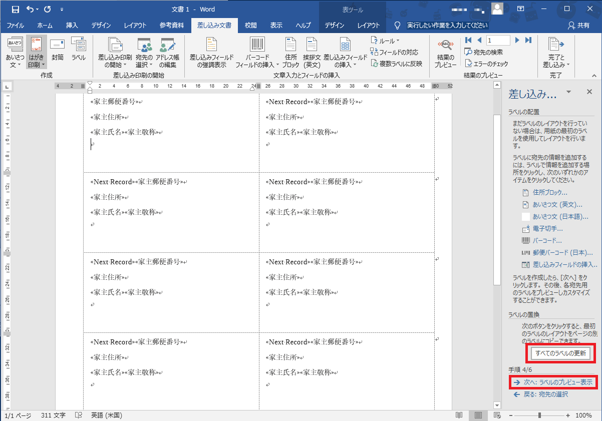 ⑪[すべてのラベルの更新]ボタンでレイアウト全体に情報を反映させ、「次へ:ラベルのプレビュー表示」へ進みます。